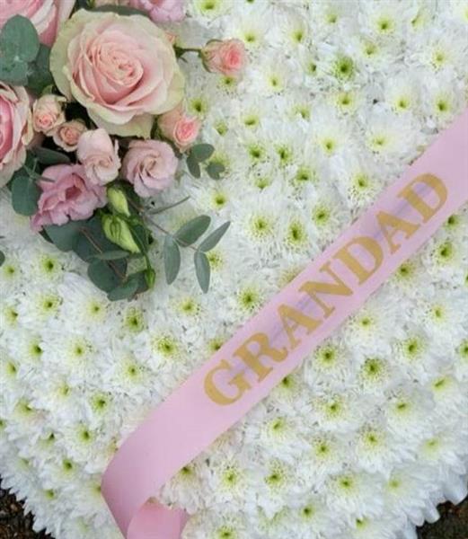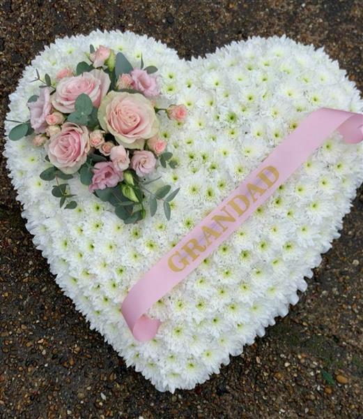 Classic white chrysanthemum based heart shaped tribute with a pretty pink spray & ribbon edge.