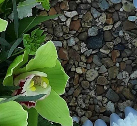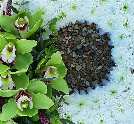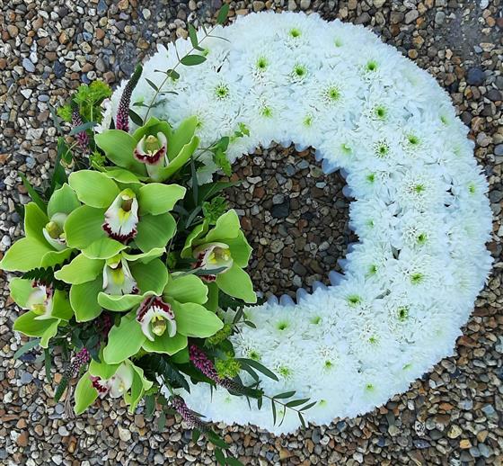 A based wreath in white spray chrysanthemum with a striking green Cymbidium orchid spray.