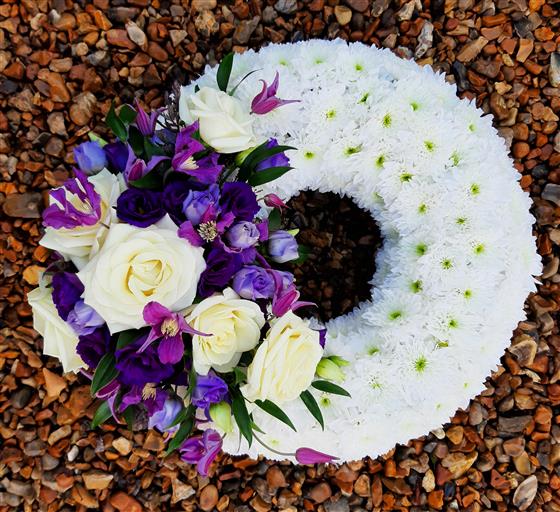 Based Wreath with a White and Purple Spray 1