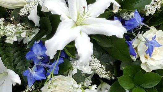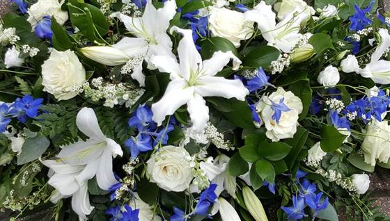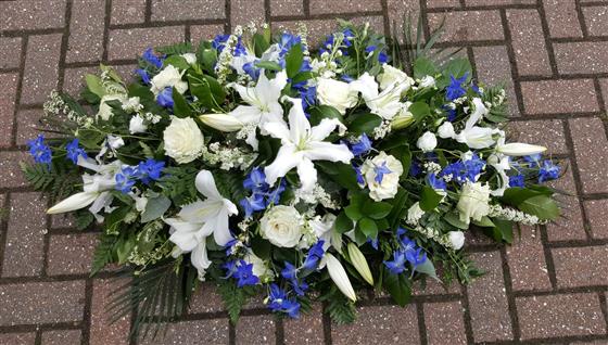 A beautiful classic double ended spray made with white Oriental lilies, roses & blue delphinium