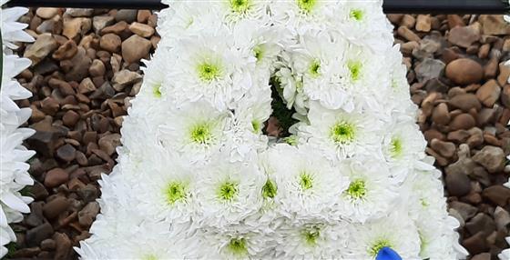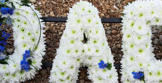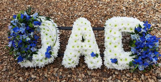 DAD based in white spray chrysanthemum with a large blue delphinium spray