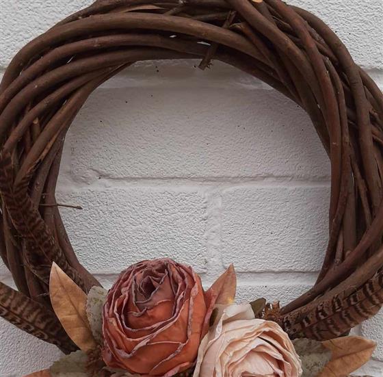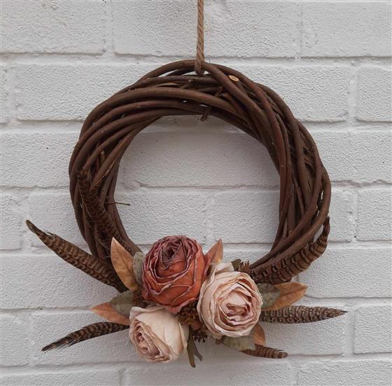 Indoor unpeeled Willow wreath ring with a lovely mix of "dry look" silk roses and feathers