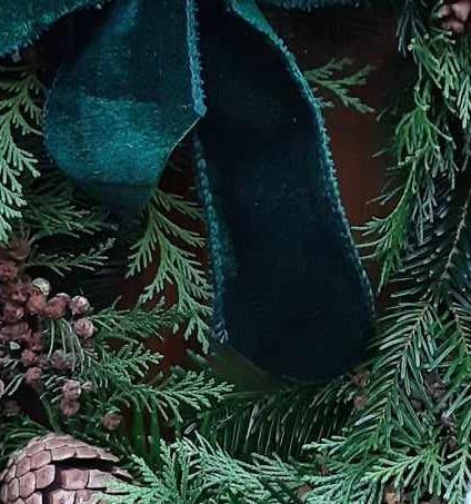 Handmade Fresh Pine Door Wreath decorated with a mix of pine cones, cotton, ribbon and a mix of seasonal foliage.
