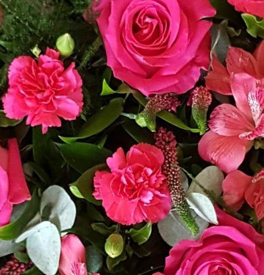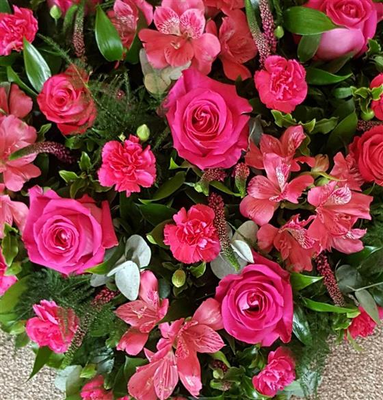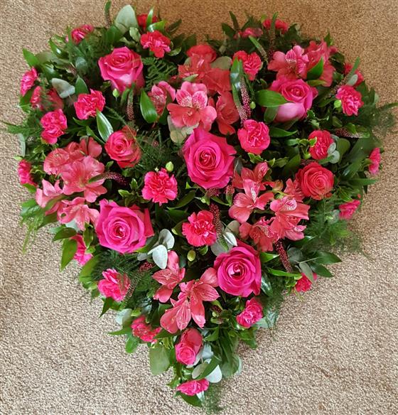 A beautiful Heart full of mixed pink flowers including roses, alstroemeria and spray carnations nestled amongst seasonal foliage.