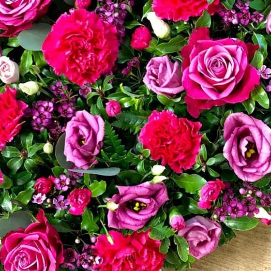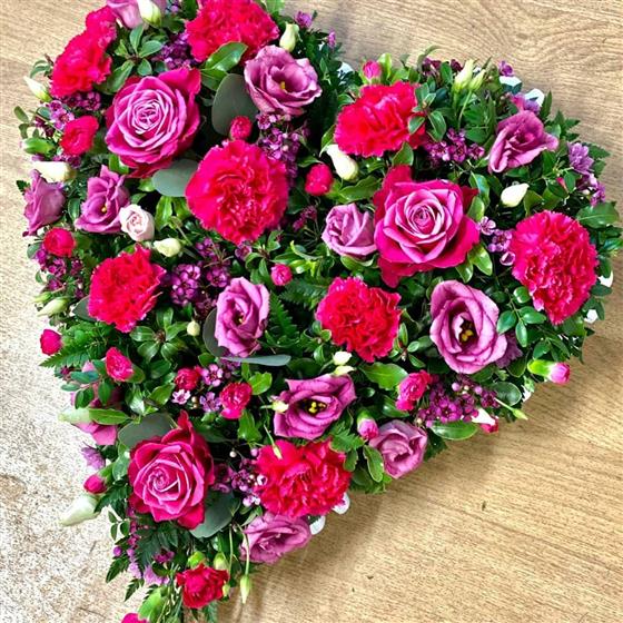 A beautiful Heart full of deep pink roses, carnations and lisianthus interspersed amongst mixed foliage.