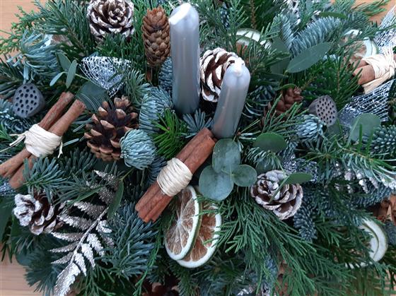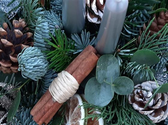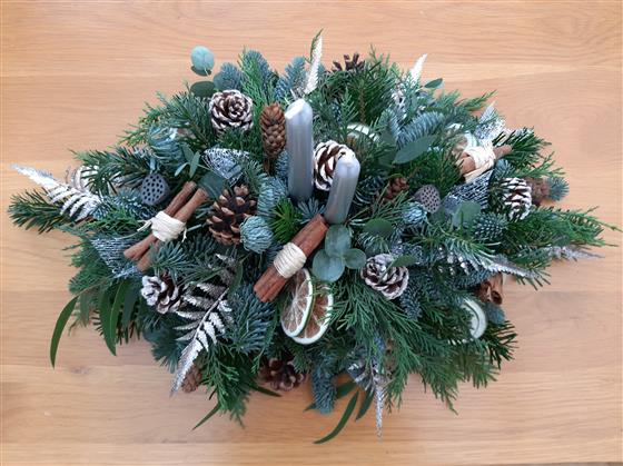 A stunning table arrangement made with fresh pine and spruce with a mix of pine cones, lime slices and cinnamon sticks