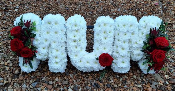 MUM based in white spray chrysanthemum with a red rose spray & white ribbon edge