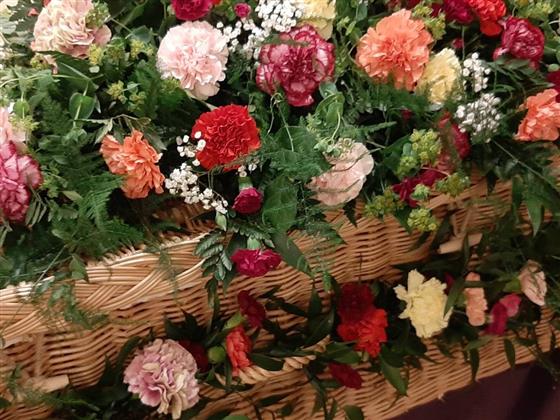 A mass of mixed carnations with a touch of gypsophila interspersed with decorative foliage with a surrounding garland to compliment.
