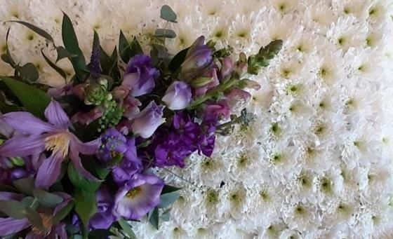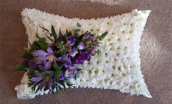 A based pillow in white spray chrysanthemums with a beautiful spray in a purples and blues