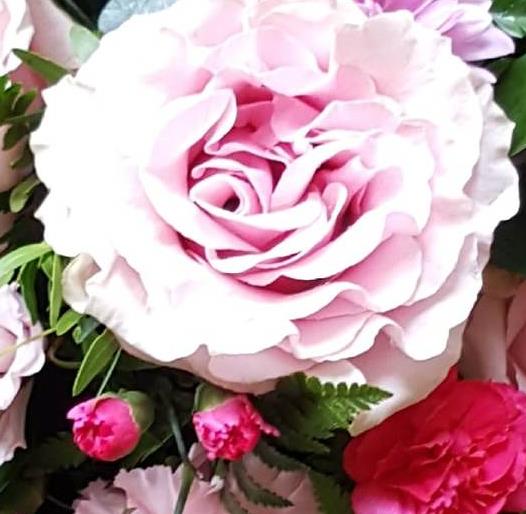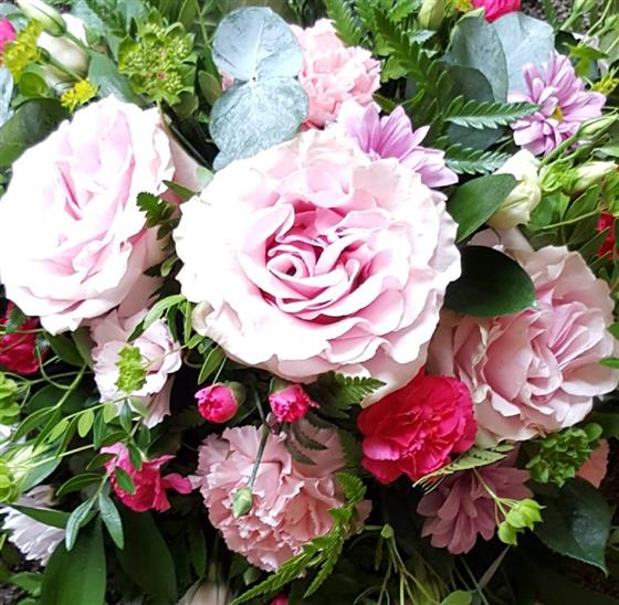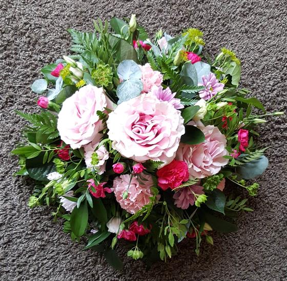 A dome shaped pretty mix of soft pink roses & carnations with pop of cerise nestled amongst green foliage