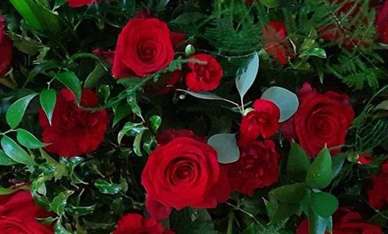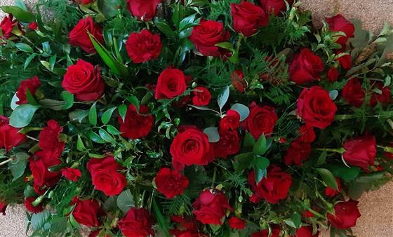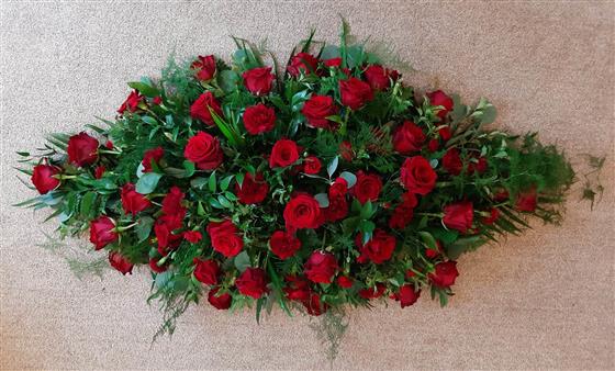 A stunning casket spray of red roses & deep red carnations complimented with lush mix of foliage.