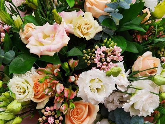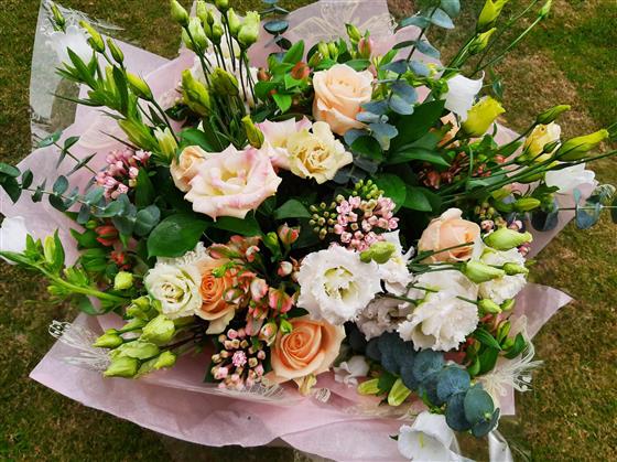 This gorgeous bouquet in peaches, pinks and creams is a beautiful mix of roses, lisianthus, bouvardia and alstromeria nestled amongst lush greenery.