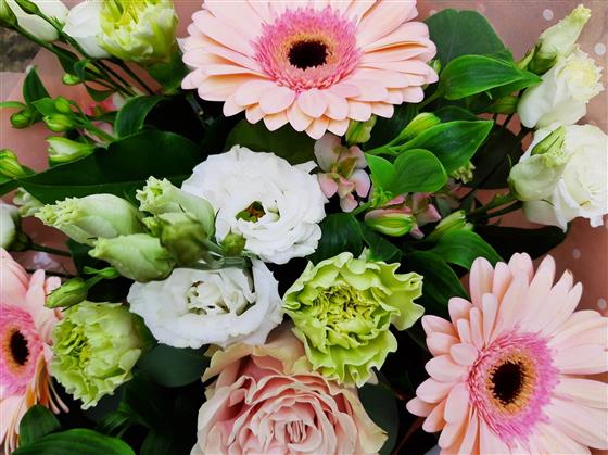 A gentle mix of pink & white flowers arranged as a hand tied bouquet delivered in water in a gift box