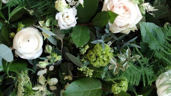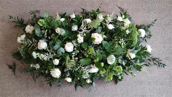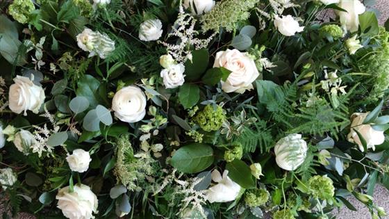 A lovely gentle mix of cream and white summer flowers complimented with lush green foliage.
