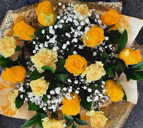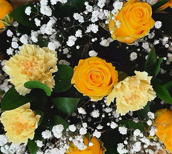 A striking bouquet of bright yellow roses, yellow carnations and white gypsophila.