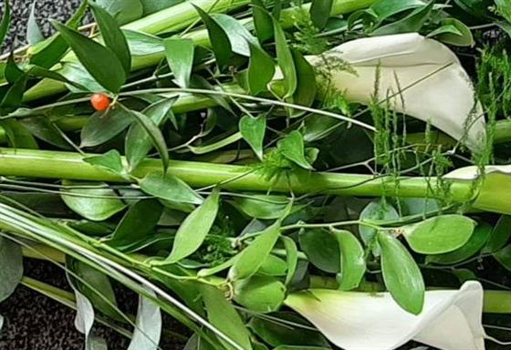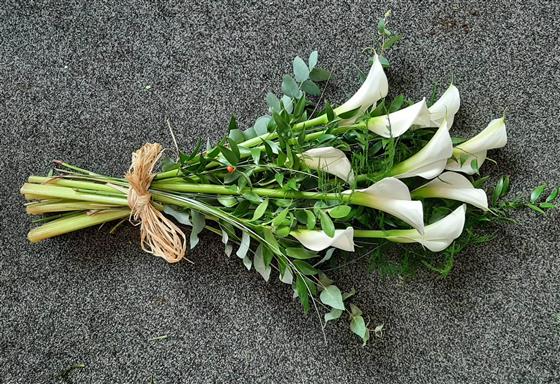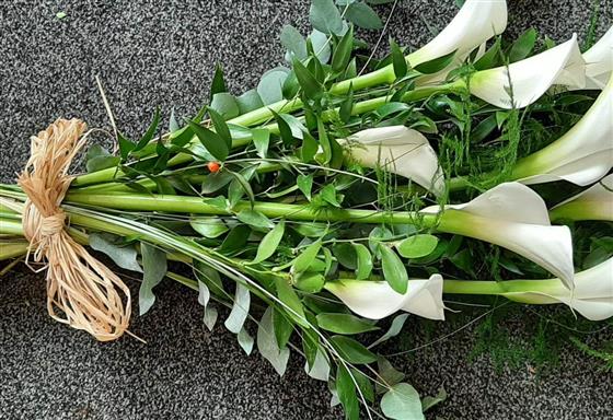 An elegant display of white Calla lilies & decorative foliage, stems tied with natural raffia