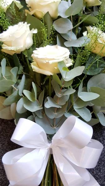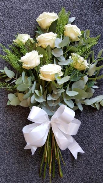 A beautiful display of 7 large head roses nestled amongst a mix of lush green foliage.